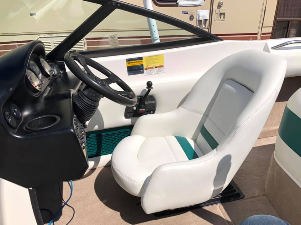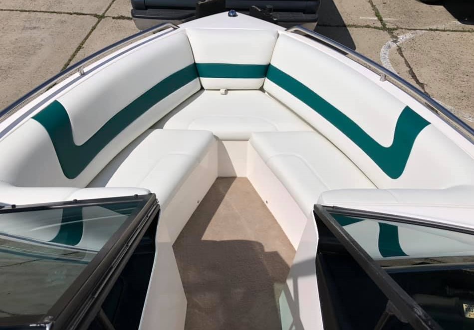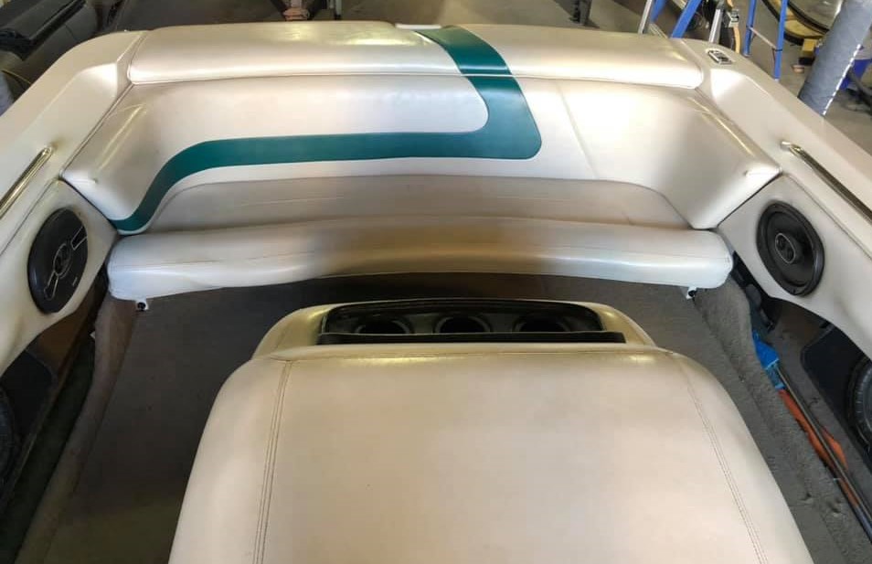 This 98 Mastercraft Pro Star got a complete restoration which included new carpet, foam, vinyl, extensive stress crack repairs and the tower was powder coated. It was a lot of work but we were happy to make an old boat look like it just left the factory!